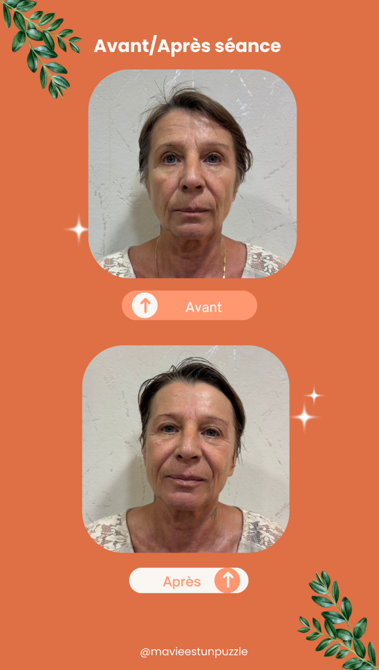 - 1 séance toutes les 2 semaines, afin de relancer les tissus, soutenir la circulation, et permettre au visage de s’installer dans une nouvelle dynamique